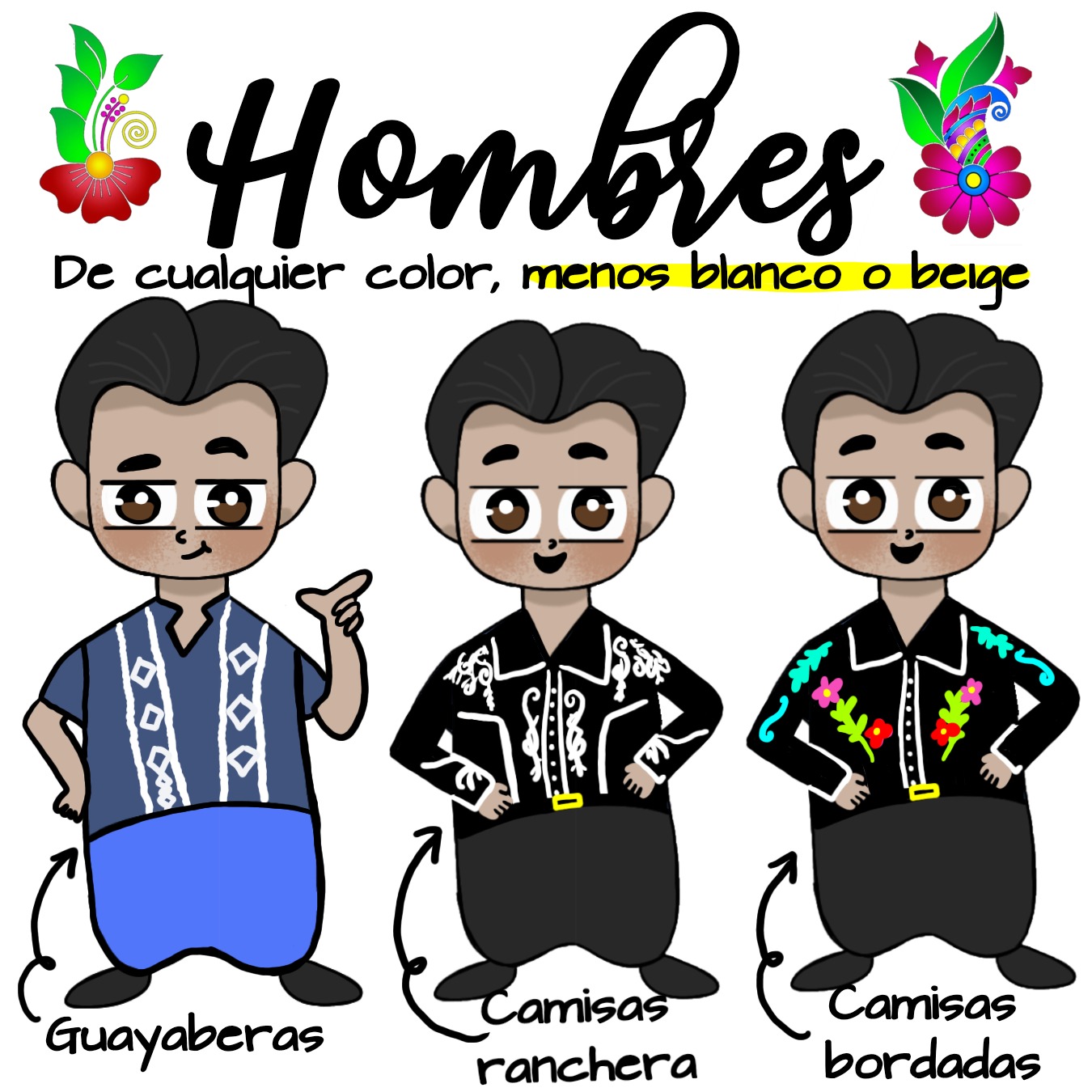 Queremos que utilices tu mejor outfit tradicional formal, evitando blancos y similares.
